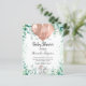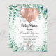 Pour un baby shower, célébrer une petite fille. Un arrière - plan blanc. Décoré de ballons d'or rose, d'une mignonne petite fille d'éléphant, de verdure d'eucalyptus et de mousseux verts. Personnalisez et ajoutez le nom de la mère à être le nom et les détails de la fête. Le nom et le texte : Baby shower sont écrits avec un script de style écrit à la main