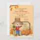 Un délicieux, invitation de chute qui est douce pour une célébration d'anniversaire à la ferme de citrouille. Elle comporte un épouvantail mignon tenant un tournesol qui est entouré avec des tiges de citrouilles, de foin et de maïs.