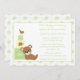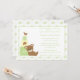 Cette invitation de baby shower 5x7 est une jolie façon d'annoncer votre baby shower! Il y a des à petits pois verts dans le arrière - plan, et un mignon petit ours en peluche penché contre des boîtes-cadeaux et un petit oiseau est assis sur le dessus. Vous pouvez facilement customiser les informations de votre parti qui se trouvent à droite. Cocoa Studio