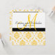 Belle Invitation Mariage damassé jaune et blanc avec monogramme sur le devant et faire-part de mariage texte sur le dos. Montré avec un exemple de libellé pour permettre l'écriture manuscrite du nom du client sur l'invitation. Tous les éléments, sauf les damas, peuvent également être customisés, ce qui permet de modifier les couleurs des lignes, des carrés et du texte.Conception de la disposition des Faire-part de mariage par Elke Clarke © 2010. Graphiques sous licence. Customisez avec vos informations et couleurs mariages.