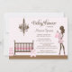 Ce invitation de baby shower de 5 x 7 filles a un motif zigzag rose et blanc de chevron en arrière - plan. Sur la gauche, un élégant lustre marron surplombe un lit bébé. À côté du lit d'enfant se trouvent trois boîtes roses avec des arcs et un ours en peluche rose. Sur la droite, il y a une élégante maman enceinte vêtue d'une robe de bébé rose. Au milieu, vous pouvez customiser toutes les informations de votre parti. Certains graphiques dans ce domaine sont par Olillia sur MyGrafico.