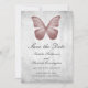Élégante et simple invitation à sauver la date de mariage avec un papillon rose sur un fond grunge gris. Ce design est un choix unique pour annoncer un mariage moderne. Facile à personnaliser avec vos détails de mariage. Cliquez sur "Personnaliser" pour trouver plus d'options de personnalisation.