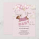 Adorable dachshund themed girl baby shower invitation illustrated with a cute dachshund wearing a pink sweater, floating amongst a bunch of soft pink and beige balloons. Playful clouds and stars add to the whimsical theme. The playful text 'A Teenie Weenie Baby is on her way' perfectly complements the theme. This invitation is sure to bring smiles whilst evoking a gentle, joyful vibe.