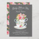tasses à thé vintages en porcelaine avec de jolies fleurs roses disposées sur un arrière - plan en lin gris pour une soirée thé baby shower.