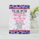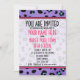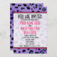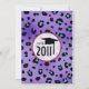 Une invitation à passer un diplôme avec un arrière - plan empreinte de léopard violet à l'avant et à l'arrière. Texte rose et noir et garniture rose. A l'opposé, le texte "Class of 2011" est placé en cercle rose avec l'illustration du casquette de graduation noir.
