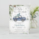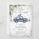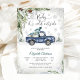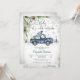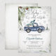Célébrez dans un style cosy avec cette charmante invitation à une baby shower hivernale mettant en vedette un camion vintage bleu à l'aquarelle transportant un sapin de Noël et des cadeaux. Les flocons de neige, les branches de pin et les arbres à feuilles persistantes créent un fond saisonnier festif, tandis que l'élégant script "Baby it's cold outside" ajoute une touche fantaisiste. Parfait pour les célébrations hivernales, ce design personnalisable allie charme rustique et joie des fêtes, ce qui en fait l'idéal pour honorer les futurs parents pendant les mois les plus froids.