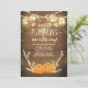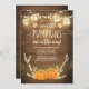 ♥ Une invitation à une baby shower amusante et mignonne pour un petit citrouille en route ! Fond en bois rustique avec des guirlandes lumineuses et deux petites citrouilles.