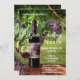 Une invitation élégante à une soirée de dégustation de vins avec une bouteille de vin, des raisins et un verre à vin dans un cadre de vignoble. Beau pour promouvoir un événement de dégustation de vins ou pour une célébration.