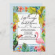 Flamingle avec cette invitation branchée et lumineuse à la douche tropicale nuptiale. Il y a une frontière avec des fleurs tropicales et des feuilles avec un flamant rose entre eux. Il y a aussi des oiseaux tropicaux colorés. Au centre, personnalisez avec vos informations de fête. Vous pouvez customiser le style, la couleur et la taille de la police. Visitez notre magasin pour voir d'autres objets de cette collection pour personnaliser votre célébration.