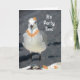 Invitation à une fête avec une Mouette de Saint-Jacques habillée de fleurs orange autour du cou et sur sa tête pour qu'elle ait l'air prête à faire la fête.