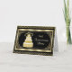 Invitation à une fête d'anniversaire de mariage de 50 ans. Une carte époustouflante en noir et or avec un gâteau doré surmonté de cœurs et d'un encadrement orné.