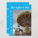 Image d'un manège de balançoires dans un parc d'attractions sur le devant. Détails de la fête au dos.