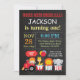 Invitation à une fête d'anniversaire de Carnaval du Cirque. Invitation pour le premier anniversaire d'un garçon. Fête sur le thème du cirque. Fond tableau noir. Pour une personnalisation plus poussée, veuillez cliquer sur le bouton "Personnaliser" et utiliser notre outil de conception pour modifier ce modèle.