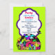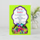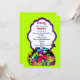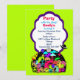 Une invitation d'anniversaire pour enfants mignonne. Un groupe de créatures monstrueuses ressemblant à des extraterrestres se rassemblant avec un thème spatial. Des planètes, un vaisseau spatial et une lune en arrière-plan sur un ciel nocturne noir étoilé. Couleurs vives et audacieuses, y compris rose chaud, vert citron, bleu clair et bien d'autres. Sur fond vert citron vif. Personnalisez avec les détails de votre fête à l'intérieur d'un cadre fantaisie avec une bordure violette.