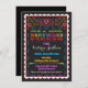 Invitation à une fête d'anniversaire Fiesta mexicaine avec bordure festonnée. Super mignonne et colorée. Inspirée par les bannières papel picado, cette invitation présente des cœurs et des fleurs décoratifs ainsi que des motifs aztèques et des bannières de couleurs vives sur fond noir. Illustration dessinée à la main par McBooboo.