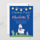 Faites la fête avec cette invitation à une fête d'anniversaire fun avec un lama. Ce design présente une guirlande de lumières de fête en forme d'étoiles sur un fond bleu foncé avec un cactus et un lama décoré d'une couronne et de fleurs.