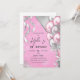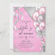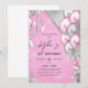Invitation à une fête d'anniversaire rose et argent avec une gerbe de ballons et de rubans scintillants et brillants.