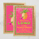 Invitation à une soirée luau avec un ananas et une hibiscus preppy sur un magnifique fond en feuille d'or rose vif, vert citron et or avec des guirlandes lumineuses. Cette invitation d'anniversaire à thème luau est facilement personnalisable pour votre événement en ajoutant simplement vos informations dans le style de police et la formulation de votre choix. Il s'agit d'une conception imprimée sans véritable feuille d'or, paillettes, etc.