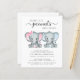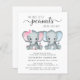 Une invitation mignonne et économique pour une fête de bébé jumeaux garçon et fille avec "Deux petits arachides adorables sont en route" écrit en typographie grise douce et un script élégant avec des fioritures, et deux aquarelles rose pastel et bleu d'éléphants bébés. Ajoutez le nom de la future maman et les détails de la fête en typographie grise simple.