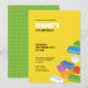 Une invitation amusante à une fête de blocs de construction aux couleurs vives et avec un design de plaque de base verte à l'arrière. Parfait pour toute célébration d'anniversaire d'enfant avec un thème de briques !