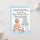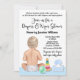 Invitation à une fête de couches et lingettes pour bébé avec un adorable bébé garçon et des jouets sur un fond à pois bleu mignon.