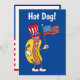 Hot Dog ! C'est une invitation drôle pour une fête du 4 juillet. Une invitation hilarante pour une fête de l'Indépendance, un pique-nique, un BBQ ou un grillade. Idéal pour une fête de grill dans la cour ! Elle présente un hot dog de dessin animé portant un chapeau patriotique et tenant un drapeau américain !