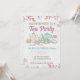 Une belle invitation à une soirée thé avec des illustrations dessinées à la main comprenant un service à thé, une assiette de gâteaux, un biscuit et un gâteau accompagnés de couverts et de thé et café fumants. Entouré de fleurs, de feuilles et de pois, c'est idéal pour les rassemblements de thé élégant, les soirées thé pour l'anniversaire des filles et des enfants et les réunions de femmes.