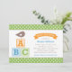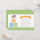 Les invitations pour les douches pour bébés à thème alphabet moderne pour un bébé garçon comprennent un mignon petit oiseau perché sur des blocs de lettres ABC, un titre de bannière, une bordure en pois de polka, et une palette de couleurs contemporaines de vert feuille, bleu ciel, orange et marron mocha.