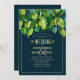 Design mariage créatif avec abondant feuillage dessiné à la main de façon moderne imitant la texture métallique. Tons vert, or, cuivre, platine, turquoise, bleu foncé. Arrière - plan bleu profond. Lettres d'or (l'or n'est pas de l'or réel mais de la couleur). Polices modernes et rationalisées. Vraiment unique, impliquant et élégant. Pour mariage de automne, mariage d'été, mariage de jardin, ou toute sorte de mariage moderne élégant.