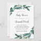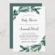 D'élégantes invitations botaniques à la douche pour bébé sont dotées d'une palette de couleurs chic de vert de forêt, d'un noir épais et d'un blanc éclatant. Les détails de votre baby shower sont drapés d'abondantes branches vertes et de feuilles dans un style aquarelle coloré et vibrant.