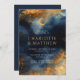 Ce faire-part de mariage céleste ciel est une interprétation abstraite moderne du thème mariage céleste. Le beige ocre foncé pour la forme lune et les noms du couple sur un bleu foncé et l'arrière - plan abstrait à thème doré font ressortir ce faire-part de mariage.