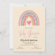Une adorable invitation baby shower parfaite pour une petite fille. Le design comprend un arc-en-ciel mignon dans les tons rose, turquoise et or accentué d'un coeur rose.