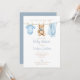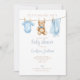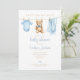 Cette invitation de baby shower mignonne présente des vêtements de bébé garçon bleu sur une corde à linge et peut être personnalisée avec vos détails dans une typographie élégante. Conçu par Thisisnotme©
