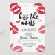 Célébrez la dernière hurrah de la future mariée avec cette invitation amusante et festive "Kiss The Miss Goodbye" Bachelorette Party! Parfait pour ceux qui souhaitent célébrer une fête mémorable et ludique, cette invitation donne le ton pour une nuit inoubliable. Que vous planifiez une escapade de fin de semaine ou une soirée chic, ce design unique apporte un mélange d'humour et d'élégance à votre fête. Le texte audacieux et dynamique "Kiss The Miss Goodbye" est associé à une mise en page élégante qui ne manquera pas d’attirer l’attention. Cette carte de haute qualité peut être personnalisée avec tous les détails de l'événement, y compris la date, l'heure, l'emplacement et les informations RSVP. Il est facile de faire de cette invitation une invitation unique, afin que vos invités soient excités pour les festivités à venir. Réalisée avec des matériaux de première qualité et disponible en différentes finitions, cette invitation est aussi amusante qu'fonctionnelle. Le design élégant et élégant est parfait pour les mariées modernes qui veulent faire une déclaration tout en gardant la classe. Que vous soyez l’hôte d’une journée spa glamour ou d’une soirée dansante amusante, cette invitation bachelorette est la meilleure façon de préparer le terrain pour une célébration fantastique. Rendez inoubliable le dernier vol de la future mariée en envoyant ces invitations amusantes et chic. Commandez la vôtre aujourd'hui et préparez-vous pour une soirée bachelorette dont tout le monde se souviendra !