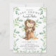 Jolie invitation baby shower avec un petit hérisson doux avec maman assise sur une souche d'arbre et encadré de feuilles d'aquarelle verte naturelle sur un arrière - plan blanc. Retournez notre invitation pour voir une feuille verte assortie pour une touche spéciale.