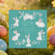Adorable invitation à dîner de Pâques avec lapins blancs sur un dos bleu turquoise avec de jolies fleurs avec un dos coordonné.
