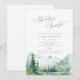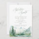 Watercolor lush green pine forest, teal river, and misty mountain with sage modern adventure awaits script, elegant and romantic, great invitation for boho rustic bridal shower and mountain forest destination wedding in spring and summer.
