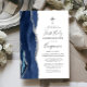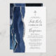 Le bord gauche de cette élégante invitation à la première communion moderne comporte une bordure en aquarelle bleu marine ornée d'une parties scintillant en faux argent. Une fausse croix de feuille argent apparaît au-dessus du texte personnalisable, qui combine écriture manuscrite, cuivre et polices italiques en gris charbon sur un arrière - plan blanc. L'envers est assorti d'un design d'agate bleu marine et argent.