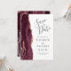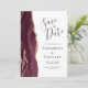 Cette élégante carte moderne de sauvegarde de date dispose d'une bordure de géode d'aquarelle bordeaux ornée d'une parties scintillant d'or rose faux. Le texte personnalisable est gris charbon sur un arrière - plan blanc. L'envers est assorti d'une agate d'or rose et bordeaux.