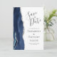Cette élégante carte de date moderne comporte une bordure en aquarelle bleu marine ornée d'une parties scintillant en faux argent. Le texte personnalisable est gris charbon sur un arrière - plan blanc. L'envers est assorti d'un design d'agate bleu marine et argent.