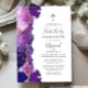 Le bord gauche de cette élégante invitation à la première communion moderne comporte une bordure d'aquarelle dans les tons bleu, rose et violet, parsemée d'étoiles scintillantes et bordée de parties scintillant en faux argent. Une fausse croix de feuille argent apparaît au-dessus du texte personnalisable, qui combine écriture manuscrite, cuivre et polices italiques en gris charbon sur un arrière - plan blanc. L'envers présente une conception d'agate correspondante.