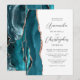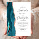 The left-hand edge of this elegant modern wedding invitation features a teal blue watercolor agate border trimmed with faux rose gold glitter. The customizable text combines script and sans serif fonts in charcoal gray on a white background. The reverse side features a matching teal and rose gold agate design.