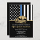 Ce design présente un drapeau de force de police avec des bandes noires et blanches, ainsi qu'une fine bande bleue. L'insigne de police et le texte doré se trouvent au-dessus de tous les détails de la fête pour la retraite de l'agent de la force de l'ordre, du shérif, du capitaine ou du chef en retraite.