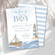 Invités Invitations pour célébrer l'arrivée imminente de votre bébé avec notre Invitation de Baby shower nautique. Cette aquarelle présente un voilier naviguant dans l'océan, un phare au loin et un ciel bleu magnifique avec des nuages fluides.