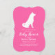Inclure le grand frère ou la soeur en fourrure bébé dans la célébration avec cet adorable design de baby shower Akita! Parfait pour un amoureux du chiot avec un bébé en route. L'Akita se trouve à côté d'une adorable calèche vintage. Le rose en fait un endroit parfait pour une petite fille en route !