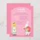 Invitation vos invités de fête à une fête de thé d'anniversaire à Wonderland avec cette invitation à la fête à thème Alice in Wonderland! Alice dans un groupe de cheveux, robe bleue et blanc pinaavant qui se tient sur une bouteille avec un étiquette "Buvez-moi". le lapin blanc dans une chemise bleue et une veste rouge, un parapluie sous son bras et en regardant l'heure de la montre de poche. Arrière - plan rose avec des points disposés en carrés diagonaux. Coloré et adorable, cet invitation est parfait pour les filles d'anniversaire qui aiment l'histoire Alice au pays des merveilles!