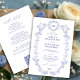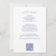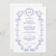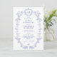 Elegant classic traditional floral French Victorian dusty blue toile de jouy chinoiserie style crest monogrammed charming budget affordable all in one wedding invitation with all the details, QR code to RSVP on website.