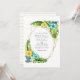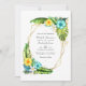 Exotique turquoise et jaune faire-part de mariage florale de plage estivale avec une abondante végétation tropicale dans un cadre géométrique doré personnalisable selon vos spécificités d'événement. Idéal pour un thème ou un mariage de jardin. Le code QR au verso dirige vers votre site mariage où les gens peuvent en savoir plus et rsvp.