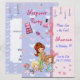 Motif festif de cœurs jolis sur fond bleu clair/lavande. Il y a des touches de jeune fille sucrées avec des nœuds roses imprimés et une garniture de dentelle. Trois petites filles sont représentées portant des pyjamas et prêtes à faire la fête. Personnalisez le texte sur le devant et le dos de cette adorable invitation à une fête d'anniversaire de soirée pyjama. Le nom, l'année d'anniversaire et toutes les informations sont prêts à être modifiés par vos soins.