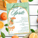 Amour chic et élégant moderne au First Spritz Bridal Shower Invitation - Doté d'une aquarelle Aperol spritz avec une garniture en tranche orange, ornée d'un arc orange coquette. L'invitation a une preppy, un arrière - plan vert rayé et une arche cadre. Les mots "Love at first Spritz" sont écrits dans un mélange de calligraphie de script raffiné et d'élégant texte vert de chasseur de blocs. Modifiez ce modèle d'invitation de douche nuptiale avec vos propres détails d'événement. Également disponible en téléchargement numérique instantané, facilement envoyer par texte, email ou médias sociaux.